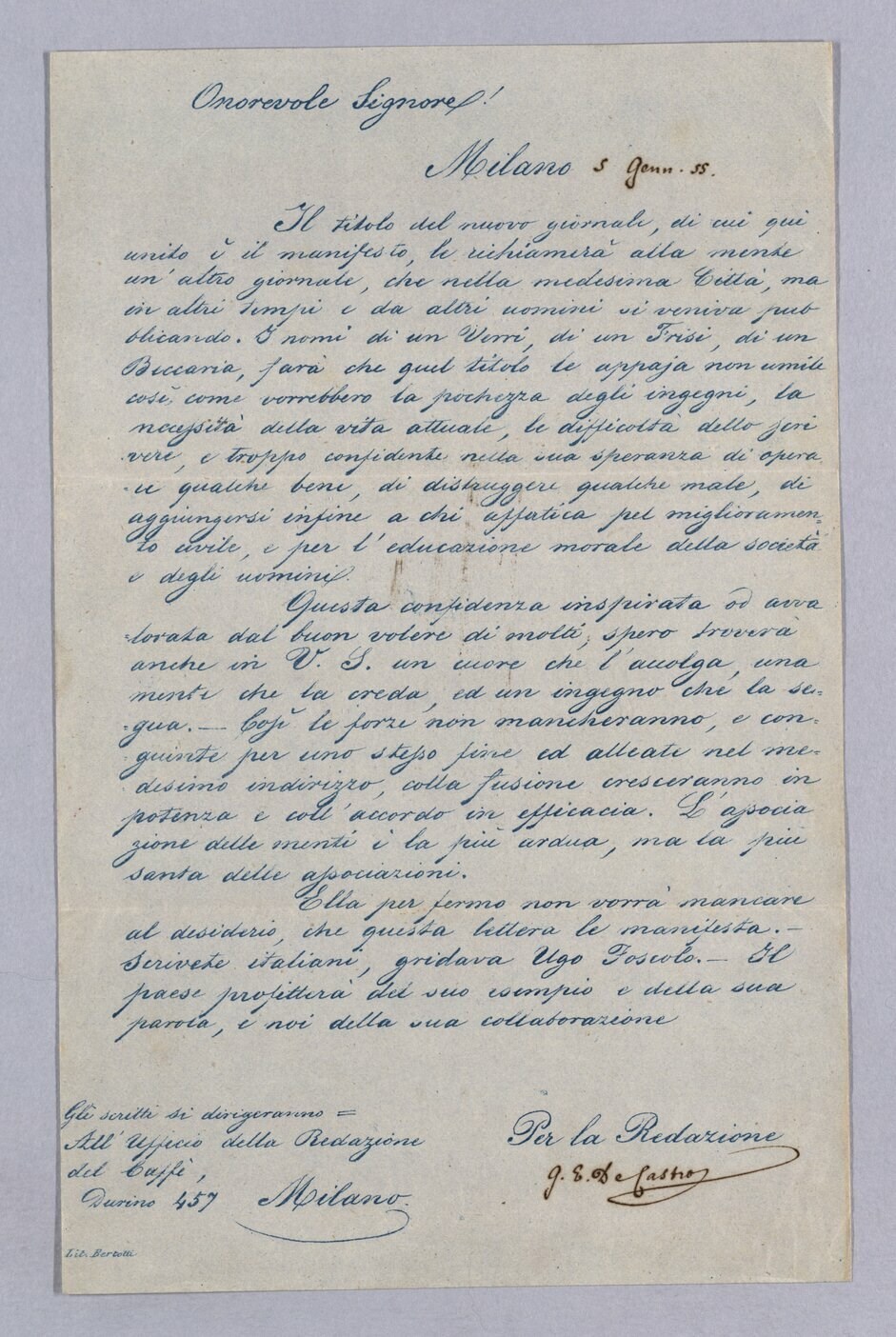 Lettera di G[iovanni] De Castro ad [Ippolito Nievo]