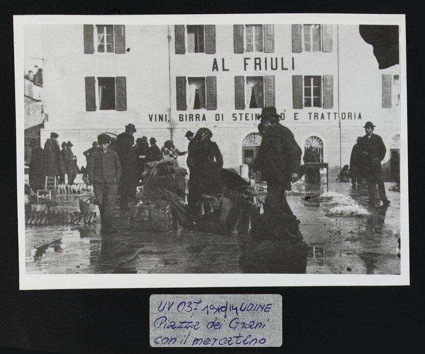 Udine: piazza XX Settembre (chiamata un tempo "piazza dei grani"). In primo piano, diverse persone che partecipano al mercato (a sinistra, scarpe oggetto di vendita). In secondo piano, la storica trattoria Al Friuli.