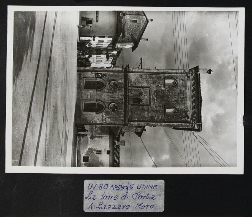 Udine, piazzale Diacono: torre di Porta Anton Lazzaro Moro (quinta cerchia muraria) posizionata alla fine di via Anton Lazzaro Moro, che viene demolita nel 1955 per migliorare la viabilità cittadina. A sinistra, l'insegna di uno spaccio di vini.