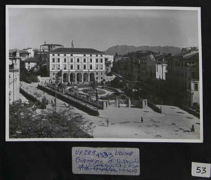 Udine: veduta di via Dante e via Giosuè Carducci. A sinistra si intravede la scuola elementare al tempo intitolata a Vittorio Emanuele III, ora a Dante Alighieri (1902-1905), nell'ex “Braida Codroipo“. Verso il centro, il Giardino "Giovanni Pascoli" progettato da Ettore Gilberti (inizi degli anni Trenta del Novecento), in origine chiamato "Giardini pubblici Arnaldo Mussolini". In secondo piano, la Casa del Littorio, costruita sotto la direzione dei lavori di Ettore Gilberti (1931-1932). A destra, Palazzo del Torso dell'architetto Provino Valle (1925-1926), sito in via Giosuè Carducci 44, inizialmente di proprietà dei Conti del Torso. Sullo sfondo, a sinistra, il castello e il campanile della chiesa di Santa Maria di Castello; a destra, le Alpi. Più indietro, la casa e bottega del fotografo Attilio Brisighelli e Palazzo Vuga di Ettore Gilberti (1910).