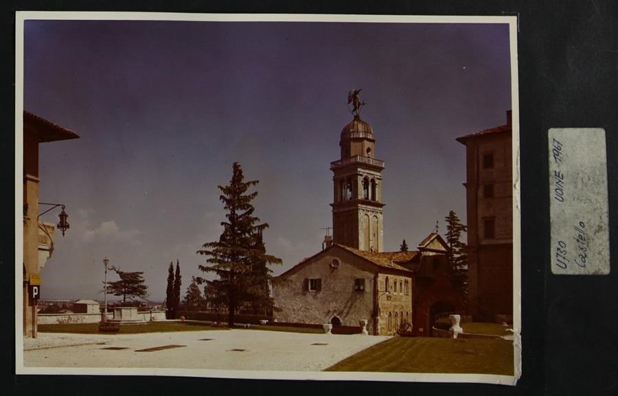 Udine: veduta del piazzale del Castello con, a destra, il castello e, all'ingresso del piazzale, porta Nuova (arco Grimani), in pietra piasentina, con arco a tutto sesto rinascimentale e il Leone di San Marco. Vicino all'arco, la Casa della Confraternita di S. Maria di Castello, edificio con archi in stile gotico sfuggito al terremoto del 1511, la chiesa di Santa Maria di Castello e il campanile cinquecentesco progettato da Gaspare Negro, con la scultura dorata e girevole rappresentante l'arcangelo Gabriele, in cima alla cupola emisferica portata a termine da Giovanni da Udine. In primo piano a sinistra si intravede la Casa della Contadinanza (diventata l'Armeria) risalente al 1931, quando si decise di erigere una copia dell'edificio cinquecentesco, sito in via Rauscedo, in cui viveva la rappresentanza dei contadini della Patria del Friuli. Sullo sfondo a sinistra si intravede, in lontananza, il panorama della città e dell'hinterland.