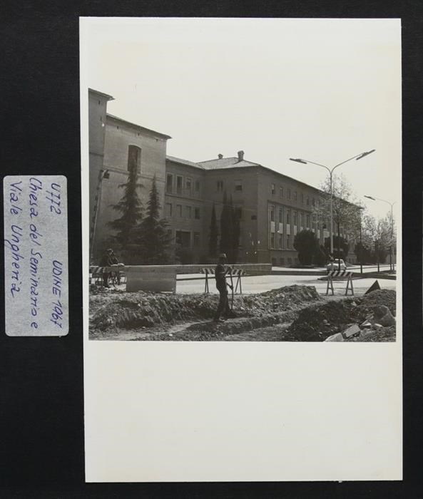 Udine, viale Ungheria: la chiesa di San Bernardino da Siena (1522), oggetto di restauro e ampliamento sia nel Settecento, su progetto di Giorgio Massari - proponendo uno stile neoclassico - sia nel 1950, a causa dei bombardamenti della seconda guerra mondiale. Accanto, il Seminario arcivescovile di Udine "San Luigi Scrosoppi". In primo piano, alcuni operai durante i lavori in corso. Si noti che viale Ungheria, essendo ancora in costruzione, stava prendendo forma a seguito dei bombardamenti (anni Cinquanta e Sessanta); infatti diverse case vennero abbattute a favore di nuovi interventi urbanistici.