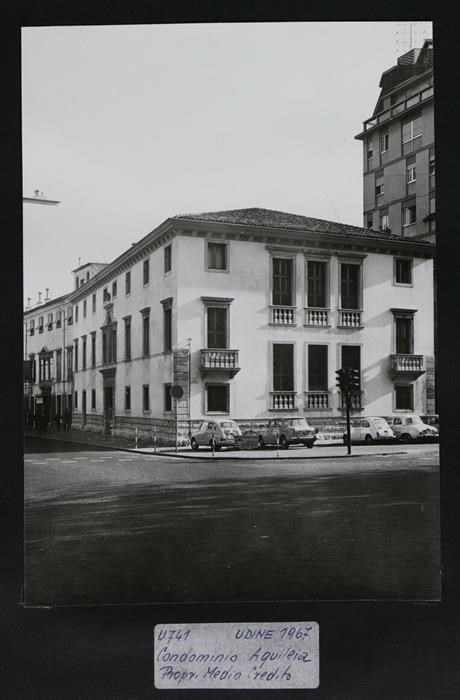 Udine, Largo Odeon e via Aquileia: Casa de Rubeis-Perusini, con la facciata su via Gorghi che presenta finestre balaustrate e che propone gli stilemi degli primi anni del XVIII secolo. Diventerà la sede del Mediocredito per le piccole e medie industrie del Friuli Venezia Giulia (fine degli anni Sessanta). In secondo piano a destra, il condominio "Moderno" (1963). Probabilmente si chiama così perché prima che venisse costruito era presente una sala cinematografica presso la vicina Casa de Rubeis-Perusini, il Cinema Moderno, chiuso nel 1962. A sinistra, Palazzo Trento-Girardis, in origine degli Antonini, a tre piani con trifora al centro.
