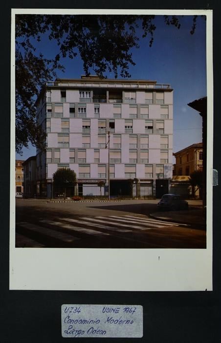 Udine, Largo Odeon: condominio "Moderno" (1963). Probabilmente si chiama così perché prima che venisse costruito, nella zona, era presente una sala cinematografica presso la vicina Casa de Rubeis-Perusini, il Cinema Moderno, chiuso nel 1962. In secondo piano a sinistra, Palazzo Rubini (presumibilmente di origine quattrocentesca) e Casa de Rubeis-Perusini, con la facciata su via Gorghi che presenta finestre balaustrate e che propone gli stilemi degli primi anni del XVIII secolo.