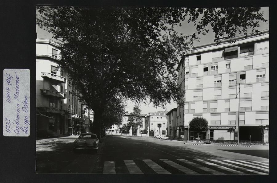Udine: veduta di Largo Odeon. A destra, condominio "Moderno" (1963). Probabilmente si chiama così perché prima che venisse costruito, nella zona, era presente una sala cinematografica presso la vicina Casa de Rubeis-Perusini, il Cinema Moderno, chiuso nel 1962. In secondo piano al centro, quattro sculture in pietra poste sulle colonne della recinzione all'ingresso di Palazzo Pontoni, all'angolo tra via Piave e via Aquileia. Accanto, Palazzo Rubini (presumibilmente di origine quattrocentesca). Di fronte, Casa de Rubeis-Perusini, con la facciata su via Gorghi che presenta finestre balaustrate e che propone gli stilemi degli primi anni del XVIII secolo.