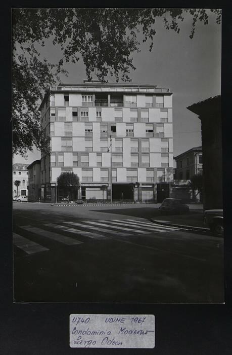 Udine, Largo Odeon: condominio "Moderno" (1963). Probabilmente si chiama così perché prima che venisse costruito, nella zona, era presente una sala cinematografica presso la vicina Casa de Rubeis-Perusini, il Cinema Moderno, chiuso nel 1962. In secondo piano a sinistra, Palazzo Rubini (presumibilmente di origine quattrocentesca) e Casa de Rubeis-Perusini, con la facciata su via Gorghi che presenta finestre balaustrate e che propone gli stilemi degli primi anni del XVIII secolo.