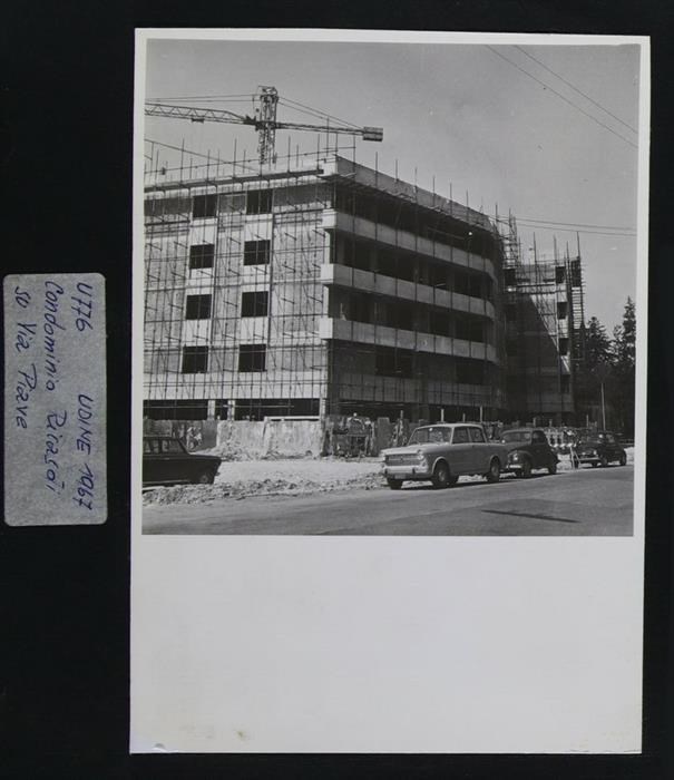 Udine, via Piave: condominio Ricasoli in fase di costruzione (sono presenti nel cantiere edile, ad esempio, una gru e le impalcature).