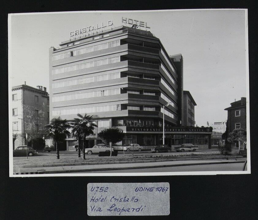 Udine, viale Giacomo Leopardi: veduta con, a sinistra, delle palme, l'hotel Cristallo e il ristorante birreria Spaten, proveniente da Monaco di Baviera.