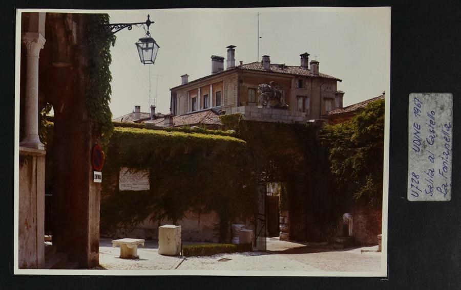Udine: veduta dell'inizio della salita da piazza Libertà al castello, che coincide con l'arco Bollani di Andrea Palladio (1556), costruito in bugnato per volere del luogotenente veneto Domenico Bollani. Vicino all'arco, delle vestigia.