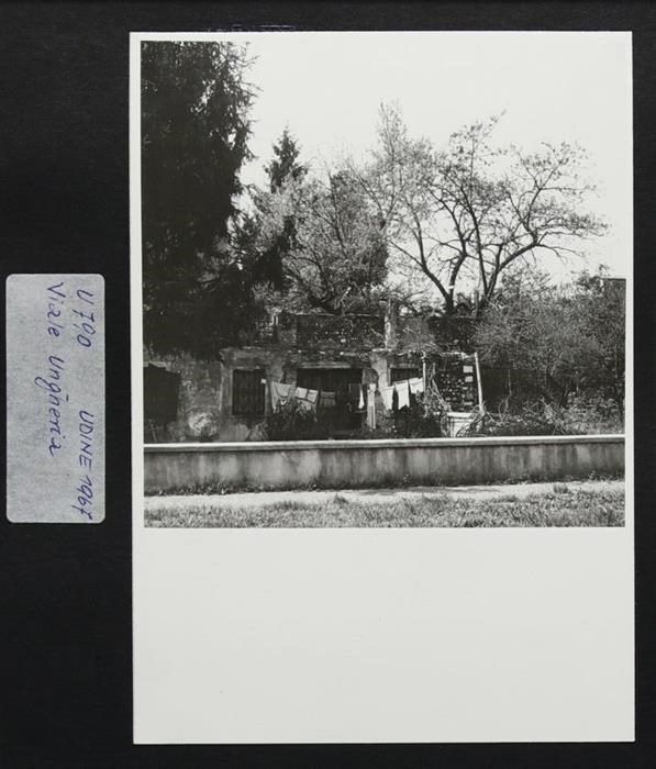 Udine, viale Ungheria: veduta con abitazione in rovina. All'esterno sono presenti dei panni stesi. Si noti che viale Ungheria, essendo ancora in costruzione, stava prendendo forma a seguito dei bombardamenti della seconda guerra mondiale (anni Cinquanta e Sessanta); infatti diverse case vennero abbattute a favore di nuovi interventi urbanistici.