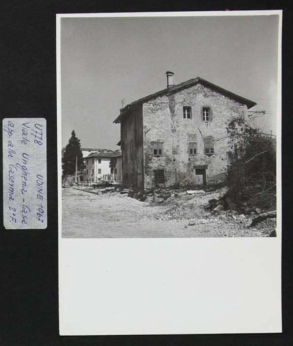 Udine, viale Ungheria: casa nella zona di riferimento per la caserma "Gerolamo Savorgnan" della Seconda Fanteria. A destra, sterpaglia. Si noti che viale Ungheria, essendo ancora in costruzione, stava prendendo forma a seguito dei bombardamenti della seconda guerra mondiale (anni Cinquanta e Sessanta); infatti diverse case vennero abbattute a favore di nuovi interventi urbanistici.