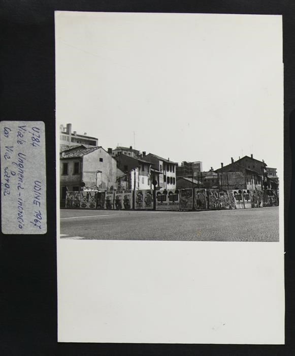 Udine: veduta dell'incrocio viale Ungheria e via Larga con abitazioni e due pareti su cui sono affissi diversi manifesti pubblicitari. Si noti che viale Ungheria, essendo ancora in costruzione, stava prendendo forma a seguito dei bombardamenti della seconda guerra mondiale (anni Cinquanta e Sessanta); infatti diverse case vennero abbattute a favore di nuovi interventi urbanistici.