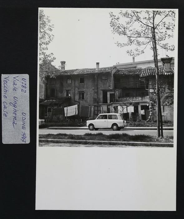 Udine, viale Ungheria: veduta di alcune vecchie abitazioni. Nel cortile sono presenti dei panni stesi ad asciugare. Al centro, un'Autobianchi Bianchina. Si noti che viale Ungheria, essendo ancora in costruzione, stava prendendo forma a seguito dei bombardamenti della seconda guerra mondiale (anni Cinquanta e Sessanta); infatti diverse case vennero abbattute a favore di nuovi interventi urbanistici.