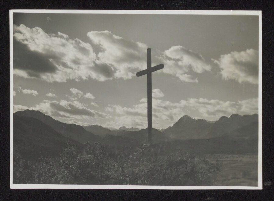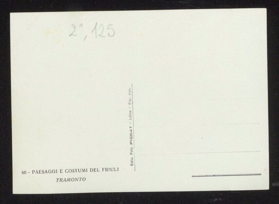 Veduta montana al tramonto, con in primo piano una croce. L'immagine è parte della serie di cartoline tutte raffiguranti una Carnia ed un Friuli arcadici, pubblicate dallo studio Pignat con il titolo "Paesaggi e Costumi del Friuli" nella seconda metà degli anni Trenta del Novecento: nella serie sono compresi scatti del fotografo Carlo Pignat e scatti del fotografo Umberto Antonelli.