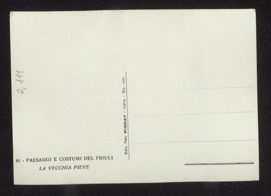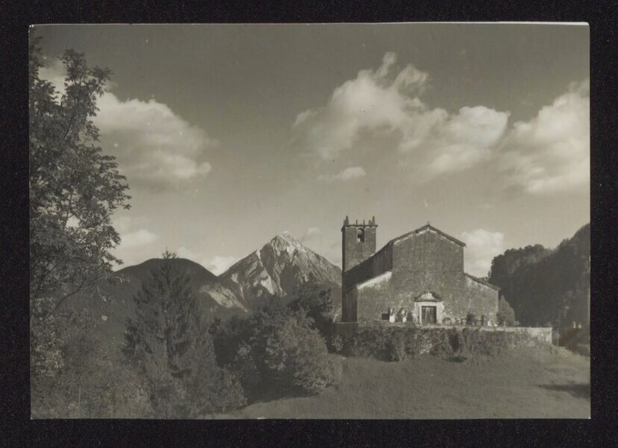 Veduta della chiesa di Santa Maria Maddalena sul Col Santino ad Invillino, frazione di Villa Santina. Sullo sfondo si vede il monte Amariana. L'immagine è parte della serie di cartoline tutte raffiguranti una Carnia ed un Friuli arcadici, pubblicate dallo studio Pignat con il titolo "Paesaggi e Costumi del Friuli" nella seconda metà degli anni Trenta del Novecento: nella serie sono compresi scatti del fotografo Carlo Pignat e scatti del fotografo Umberto Antonelli.