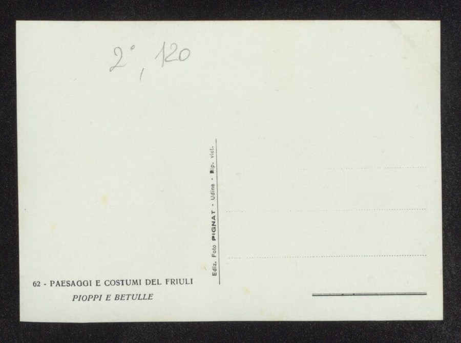 Veduta dei pioppi e delle betulle sul lago di Cavazzo. L'immagine è parte della serie di cartoline tutte raffiguranti una Carnia ed un Friuli arcadici, pubblicate dallo studio Pignat con il titolo "Paesaggi e Costumi del Friuli" nella seconda metà degli anni Trenta del Novecento: nella serie sono compresi scatti del fotografo Carlo Pignat e scatti del fotografo Umberto Antonelli.