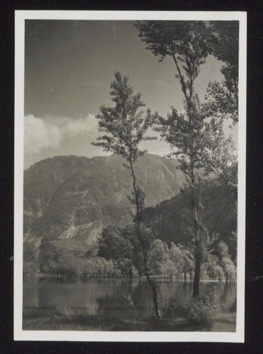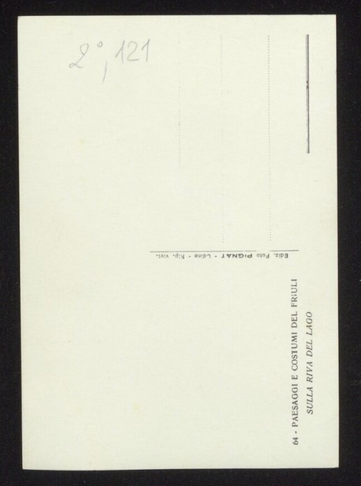Veduta del lago di Cavazzo, sullo sfondo il monte San Simeone. L'immagine è parte della serie di cartoline tutte raffiguranti una Carnia ed un Friuli arcadici, pubblicate dallo studio Pignat con il titolo "Paesaggi e Costumi del Friuli" nella seconda metà degli anni Trenta del Novecento: nella serie sono compresi scatti del fotografo Carlo Pignat e scatti del fotografo Umberto Antonelli.