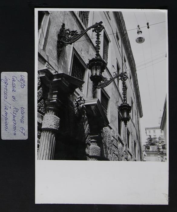 Udine, via del Monte: particolare con i due lampioni e il portale del palazzo cinquecentesco del Monte di Pietà, con portico in bugnato e trifore presenti nel piano nobile, su cui sono stati effettuati degli interventi (seconda metà del XVII secolo). Agli angoli, delle sculture in marmo che rappresentano la Pietà. Sullo sfondo, in basso a destra, il castello.