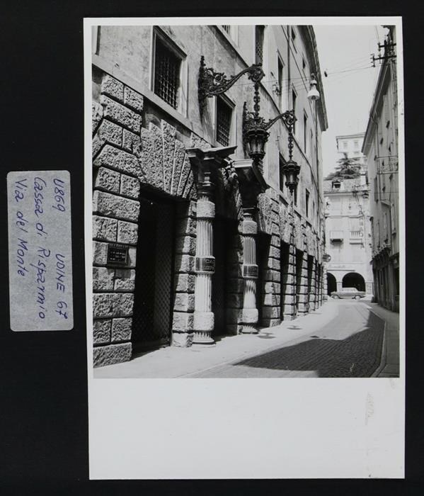 Udine, via del Monte: particolare del palazzo cinquecentesco del Monte di Pietà, con portico in bugnato e trifore presenti nel piano nobile, su cui sono stati effettuati degli interventi (seconda metà del XVII secolo). Agli angoli, delle sculture in marmo che rappresentano la Pietà. Sullo sfondo, in alto a destra, il castello.