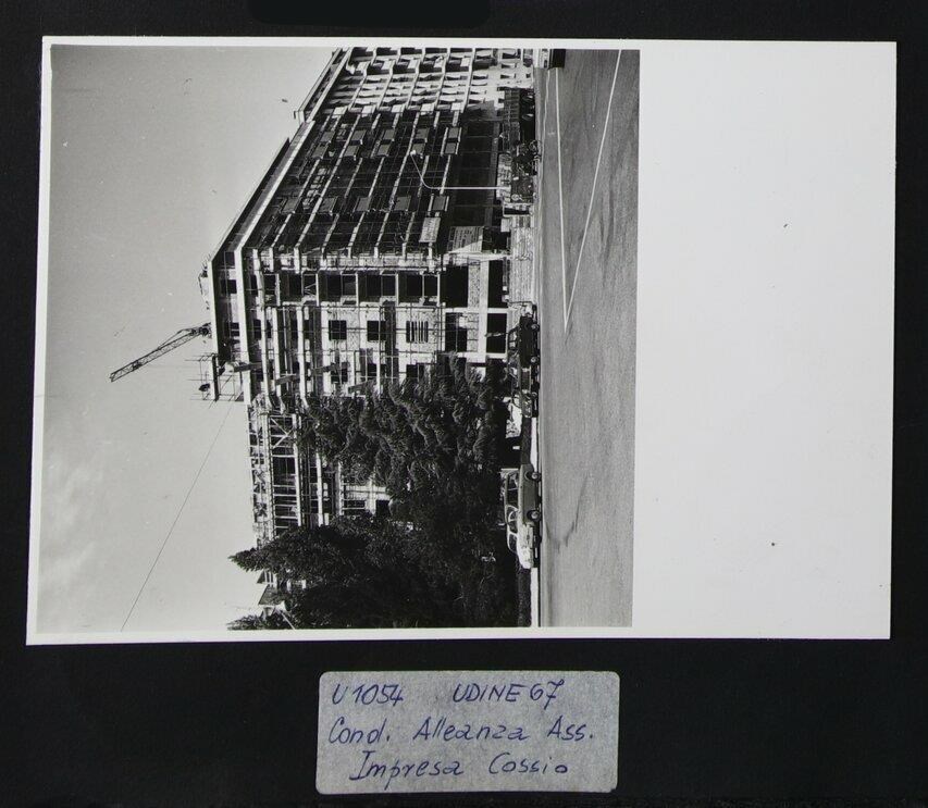 Udine, viale della Vittoria 2: condominio dell'Alleanza Assicurazioni in costruzione (impresia Cossio), presso il cantiere edile, con impalcature e gru.
