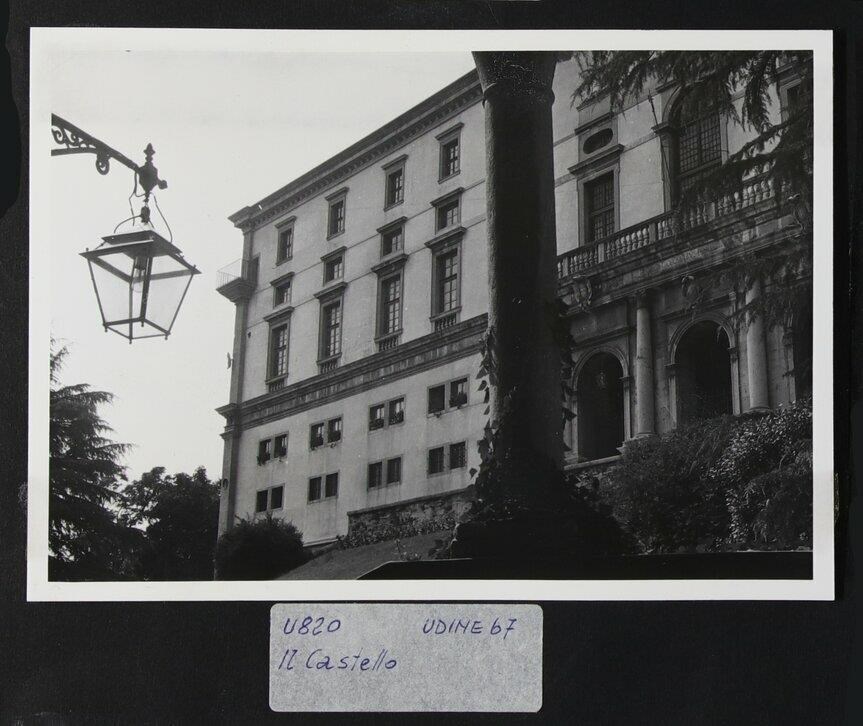 Udine: salita da piazza Libertà al castello. Veduta del castello dall'interno del porticato ad elementi sfalsati, in stile tardogotico veneziano, voluto dal luogotenente Tommaso Lippomano (1486). Infatti, in primo piano, si noti una delle colonne ricoperta di edera rampicante. A sinistra, un piccolo lampione attaccato al porticato.