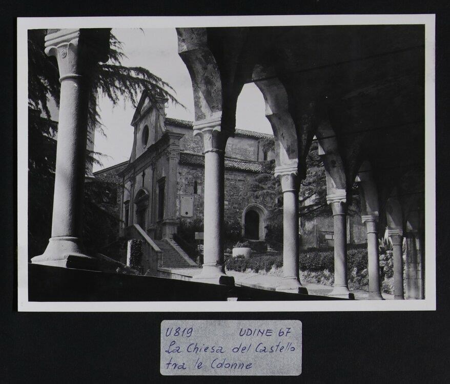Udine: salita da piazza Libertà al castello. Veduta dall'interno del porticato ad elementi sfalsati, in stile tardogotico veneziano, voluto dal luogotenente Tommaso Lippomano (1486), della chiesa di Santa Maria di Castello. In secondo piano a sinistra si intravede il castello. Sullo sfondo, sempre a sinistra, la Casa della Confraternita di S. Maria di Castello, edificio con archi in stile gotico sfuggito al terremoto del 1511.
