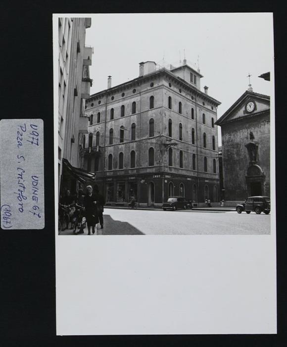 Udine: veduta di uno scorcio di piazza San Cristoforo con, a destra, la chiesa di San Cristoforo (1358), caratterizzata dal portale principale di Bernardino da Bissone (1518), il quale presenta una lunetta con uno stemma. La facciata è altresì contraddistinta da un timpano con modanatura e da un orologio.