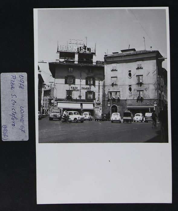 Udine: veduta di uno scorcio di via Andrea Palladio e di piazza San Cristoforo. Si riconosce, in alto a sinistra, in cima all'edificio, l'insegna della birra Dormisch (lo stabilimento della Birreria venne fondato nel 1892). Sotto, l'insegna dello studio fotografico Valent. In basso a sinistra, un mezzo che riporta il nome dell'azienda Coca-Cola.