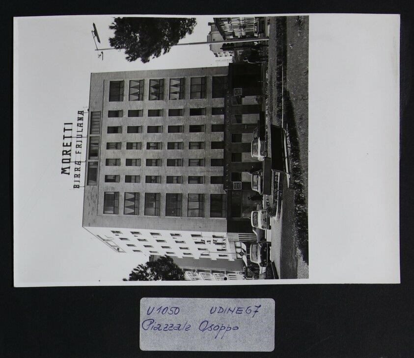 Udine, piazzale Osoppo: edificio ex sede della CRUP (Cassa di Risparmio di Udine e Pordenone, al piano terra) dell'architetto Ermes Midena (1940-1950), con l'insegna "MORETTI/ BIRRA FRIULANA". L'edificio è sviluppato su otto piani nel rispetto della tipologia a blocco. A destra si intravede Palazzo Garzolini di Toppo-Wassermann, costruito agli inizi del Settecento e divenuto sede del collegio nel 1900.