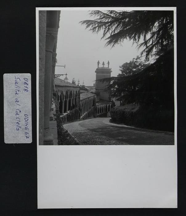 Udine: veduta della salita da piazza Libertà al castello con il porticato ad elementi sfalsati, in stile tardogotico veneziano, voluto dal luogotenente Tommaso Lippomano (1486). In secondo piano, al centro, la Torre dell'Orologio, di Giovanni da Udine (1527), che si innesta sulla Loggia di San Giovanni. In cima alla Torre, i due Mori e, in mezzo a loro, una campana. Sullo sfondo al centro, la Loggia del Lionello, finita di costruire per volere di Nicolò Lionello.