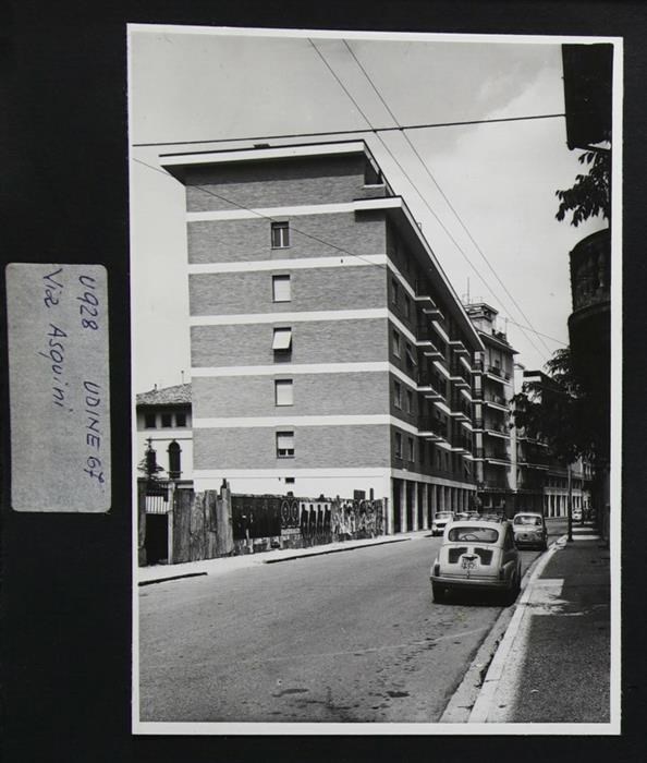 Udine: veduta di via Fabio Asquini, al tempo in via di urbanizzazione, con condomini. In secondo piano a sinistra si intravede Palazzo Colloredo-Orgnani, ristrutturato in più occasioni (fine del XVII secolo-inizi del XVIII secolo, 1860), rendendo l'edificio nello stato attuale..