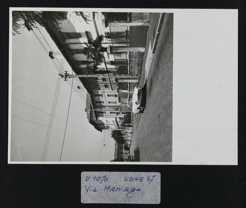 Udine: veduta di via Maniago con, in secondo piano a sinistra, il Collegio "Nostra Signora dell’Orto", al civico n. 27, realizzato quale edificio con chiostro interno su progetto dell'architetto Pietro Zanini (impresa costruttrice f.lli Agosto).