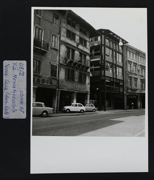 Udine, via Mercatovecchio 26: veduta di quello che era il sedime della Cappelleria Comis & C., demolita nel 1963. Successivamente venne appunto costruito lì "Palazzo Rosso" Talmone, dell'architetto Gino Valle (nello scatto, verso destra). All'estrema destra, Palazzo Fabris-Casa Fornara, sviluppato su quattro piani e realizzato su disegno di Luigi Taddio. Come esercizi commerciali si riconoscono una farmacia e Bata. A sinistra rispetto a Palazzo Talmone, Casa Sabbadini, con affreschi sulla facciata di Giovanni Battista Grassi (1554), di cui rimane la rappresentazione di Giove. In questo punto c'era il traguardo della corsa dei cavalli che divenne una tradizione dalla metà del XIV secolo in occasione, ogni anno, del giorno di San Giorgio.
