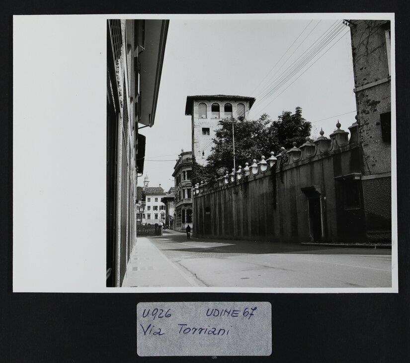 Udine: veduta di via dei Torriani. A destra si intravede Palazzo Torriani (fine del Cinquecento), venduto al conte Ludovico Manin, ma alla fine degli anni Sessanta del XVIII secolo passò ai conti della Torre. Ex sede degli alloggi degli ufficiali del comando supremo tra il 1915 e il 1918, l'edificio viene saccheggiato dall'invasione austro-tedesca: a causa del conflitto e dell'incuria la proprietà subisce diversi danni. Verso il centro, la Torre di Santa Maria.