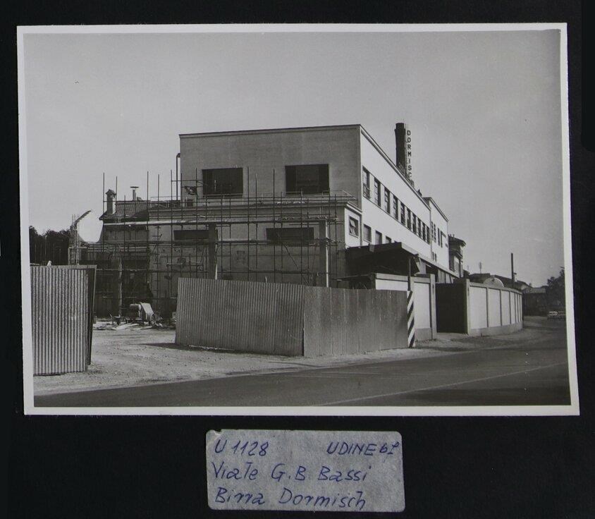 Udine, viale Gio Batta Bassi: ciminiera e stabilimento della Birreria Dormisch fondato nel 1892 (si noti l'insegna della fabbrica). Lo scatto riprende la costruzione, su progetto dell'architetto Emilio Mattioni, del corpo situato a nord (1967). Sullo sfondo a destra si intravede la Palazzina Dormisch, realizzata su progetto dell'architetto Ettore Gilberti (1928).