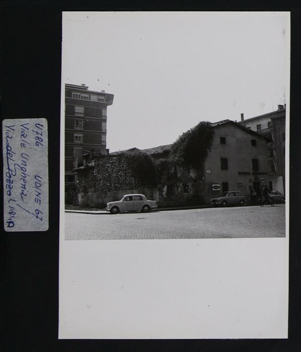Udine: veduta dell'incrocio viale Ungheria e via Larga con abitazioni, su cui c'è dell'edera rampicante. A destra, l'insegna "Birra Moretti". Si noti che viale Ungheria, essendo ancora in costruzione, stava prendendo forma a seguito dei bombardamenti della seconda guerra mondiale (anni Cinquanta e Sessanta); infatti diverse case vennero abbattute a favore di nuovi interventi urbanistici.