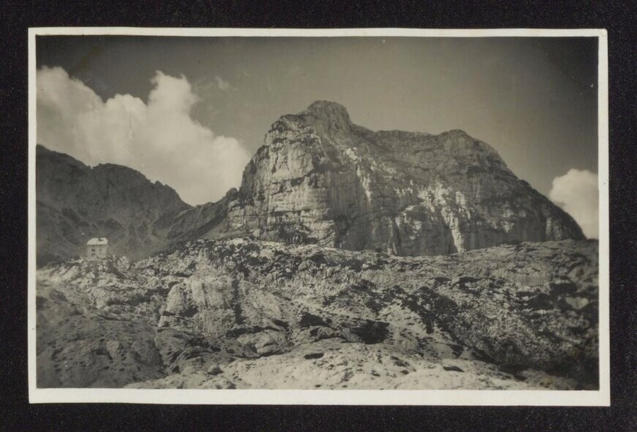 Veduta del Gruppo del Canin e del Monte Bila Pec, cima rocciosa sul versante settentrionale del Gruppo, che emerge dall'altopiano carsico con una verticale parete e domina la conca del “Vallon di Prevala” dove si trova il Rifugio Gilberti - Soravito, a sinistra nell'immagine. Il Rifugio, inaugurato nel 1934, venne dedicato all’alpinista udinese Celso Gilberti, caduto giovanissimo sulla Paganella e all’altrettanto importante alpinista friulano Oscar Soravito, che di Gilberti fu compagno di cordata.