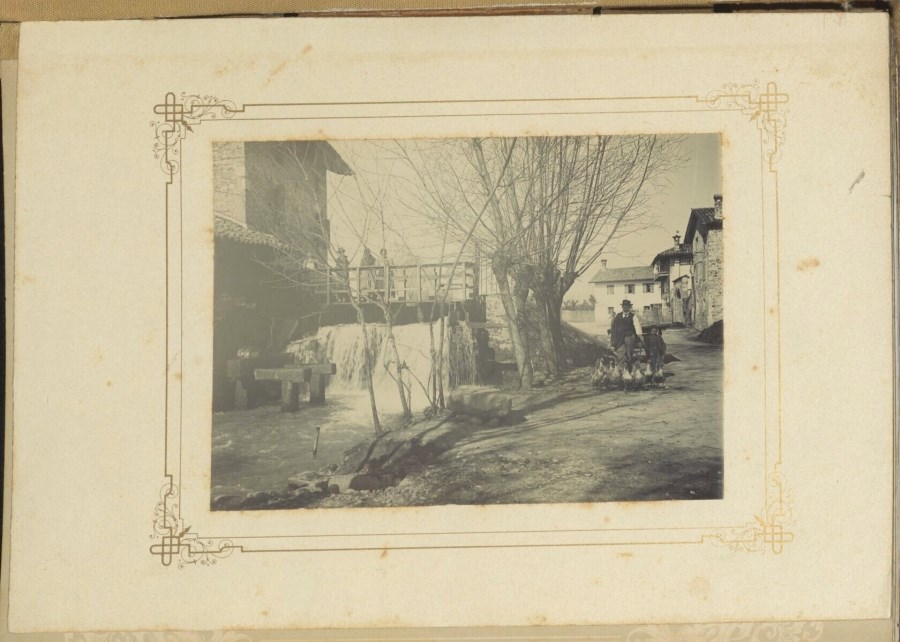 Ritratto di un uomo e un bambino mentre accompagnano delle oche lungo una strada sterrata di un paese; a sinistra un corso d'acqua ed un piccolo ponte ove stazionano dei passanti.