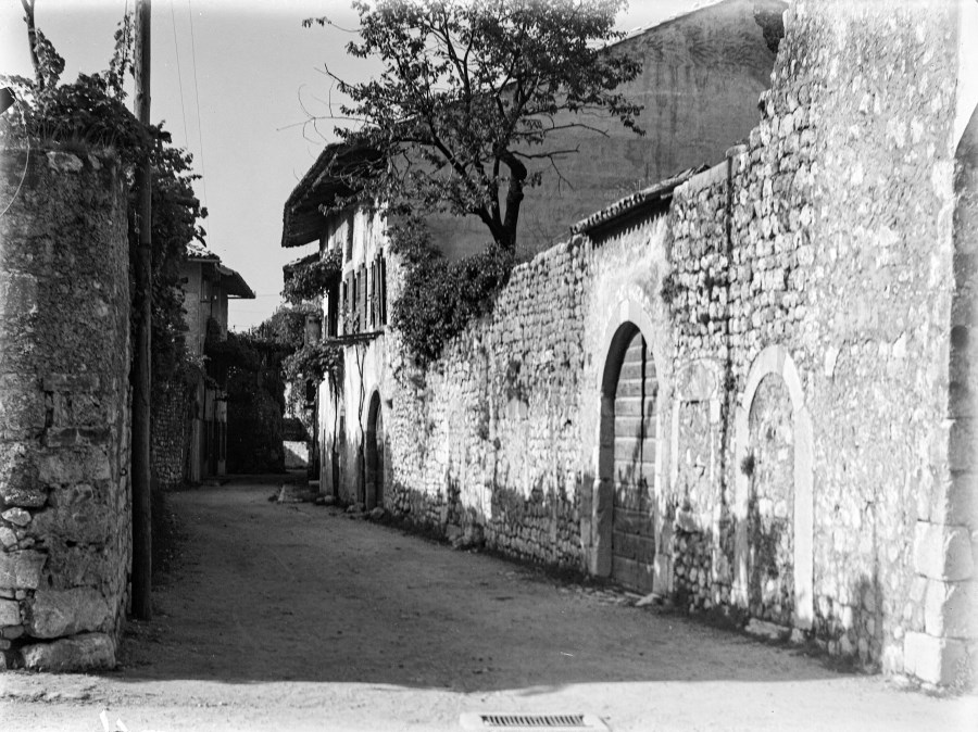 Veduta di antiche case carniche con muri in sasso in una via di Venzone.