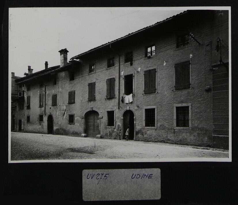 Udine: veduta con abitazioni storiche. In basso, al centro, una bambina che sta entrando in un casolare. Dalla finestra del piano centrale, dei panni stesi.