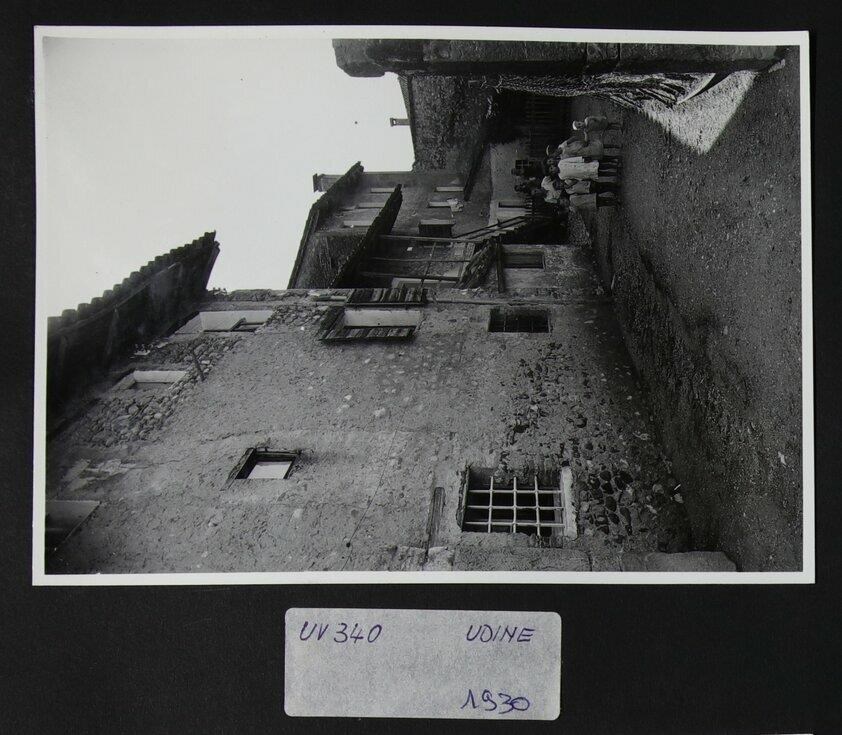 Udine: veduta di abitazioni storiche. A destra, un gruppo di sei bambini affiancati da un signore che guarda verso l'obiettivo in posa. Dietro, distaccati dal gruppo, un uomo e una donna, sempre in posa.