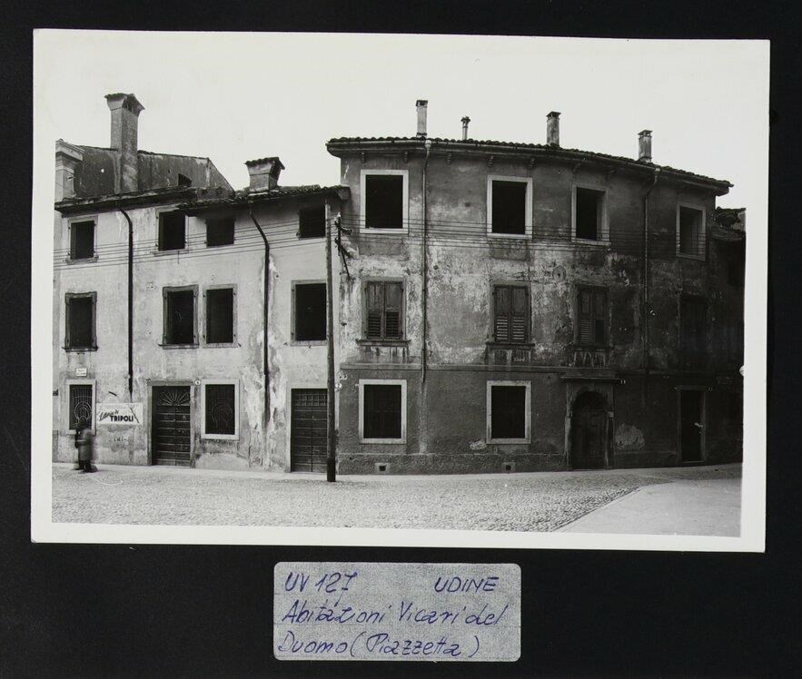 Udine: veduta di uno scorcio di piazza del Duomo con alcune abitazioni. In basso a sinistra, un signore e un'insegna che riporta il nome della città di Tripoli (collegata presumibilmente al periodo storico della Libia italiana, dal 1934 al 1943).