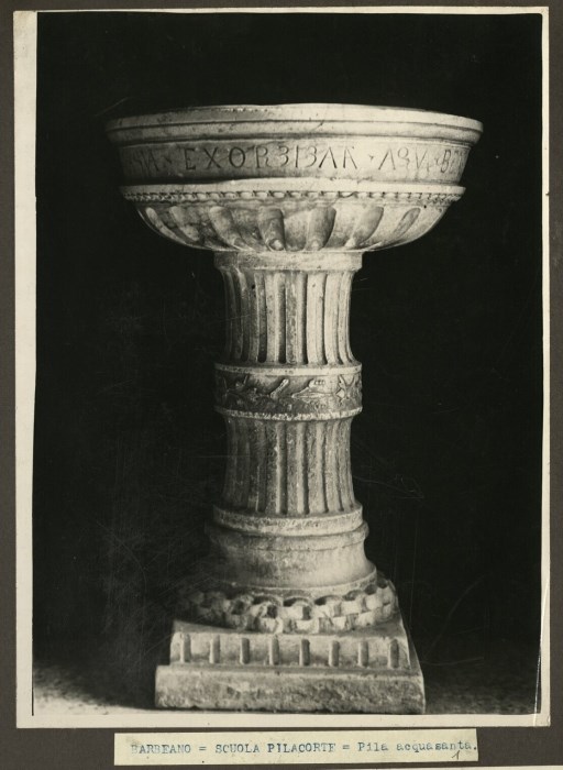 Riproduzione fotografica di un'acquasantiera in pietra attribuita alla scuola del Pilacorte conservata presso la Chiesa di Santa Maria Maddalena a Barbeano.