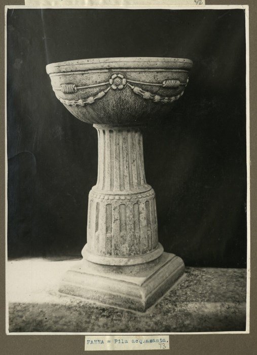 Riproduzione fotografica di un'acquasantiera in pietra conservata presso la Chiesa di San Martino Vescovo di Fanna.