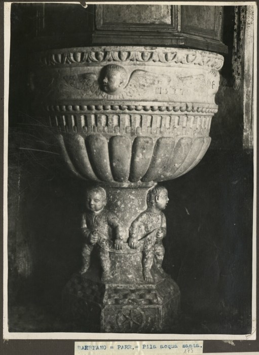 Riproduzione fotografica di un'acquasantiera in pietra conservata presso la Chiesa di Santa Maria Maddalena a Barbeano di Spilimbergo.