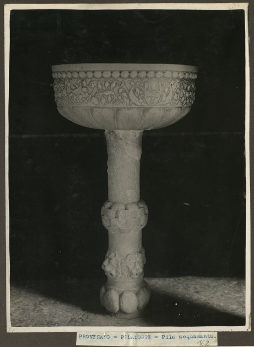 Riproduzione fotografica di un'acquasantiera ad opera del Pilacorte e conservata presso la Chiesa di San Leonardo a Provesano di San Giorgio della Richinvelda.