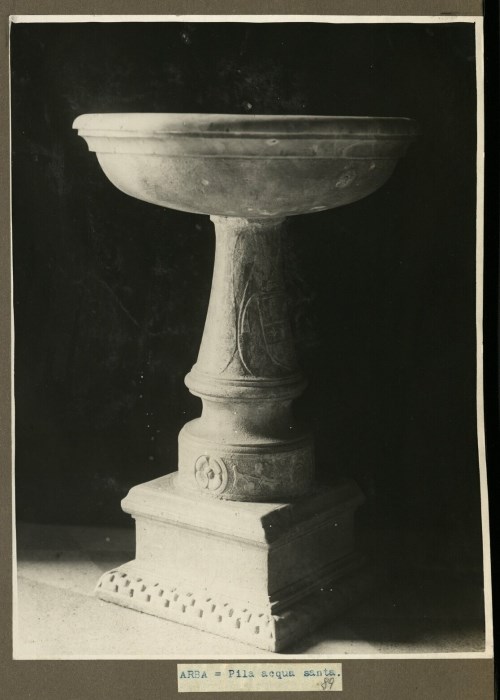 Riproduzione fotografica di un'acquasantiera in pietra conservata presso la Chiesa di San Michele Arcangelo a Arba.