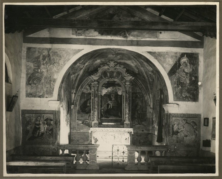 Riproduzione fotografica del coro della Chiesa di Santa Caterina d'Alessandria a Marsure di Aviano, diviso dall'unica navata dalla balaustra. Sulle pareti ed attribuiti a Pomponio Amalteo degli affreschi con le storie di Santa Caterina e della Vergine. Al centro del coro un altare in marmo con pala dipinta della "Madonna con Bambino".