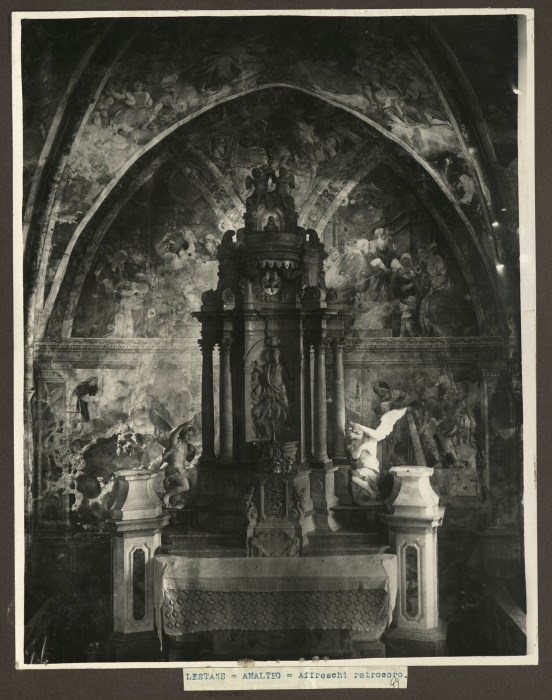 Riproduzione fotografica degli affreschi situati nel retro coro dell'abside nella Chiesa di Santa Maria Assunta a Lestans di Sequals e ad opera di Pomponio Amalteo nel 1546 circa. Centralmente l'altare maggiore in marmo.