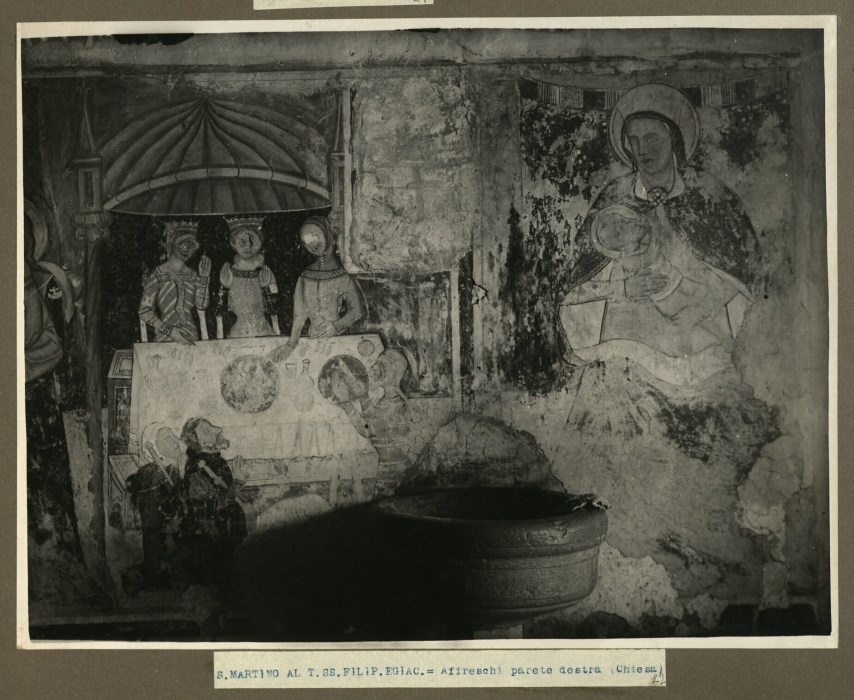 Riproduzione fotografica degli affreschi accanto al coro nella Chiesa dei Santi Filippo e Giacomo a San Martino al Tagliamento: a destra la "Madonna in trono con Bambino", a sinistra una tavola imbandita con persone festanti e due santi inginocchiati. In basso un'acquasantiera in pietra.